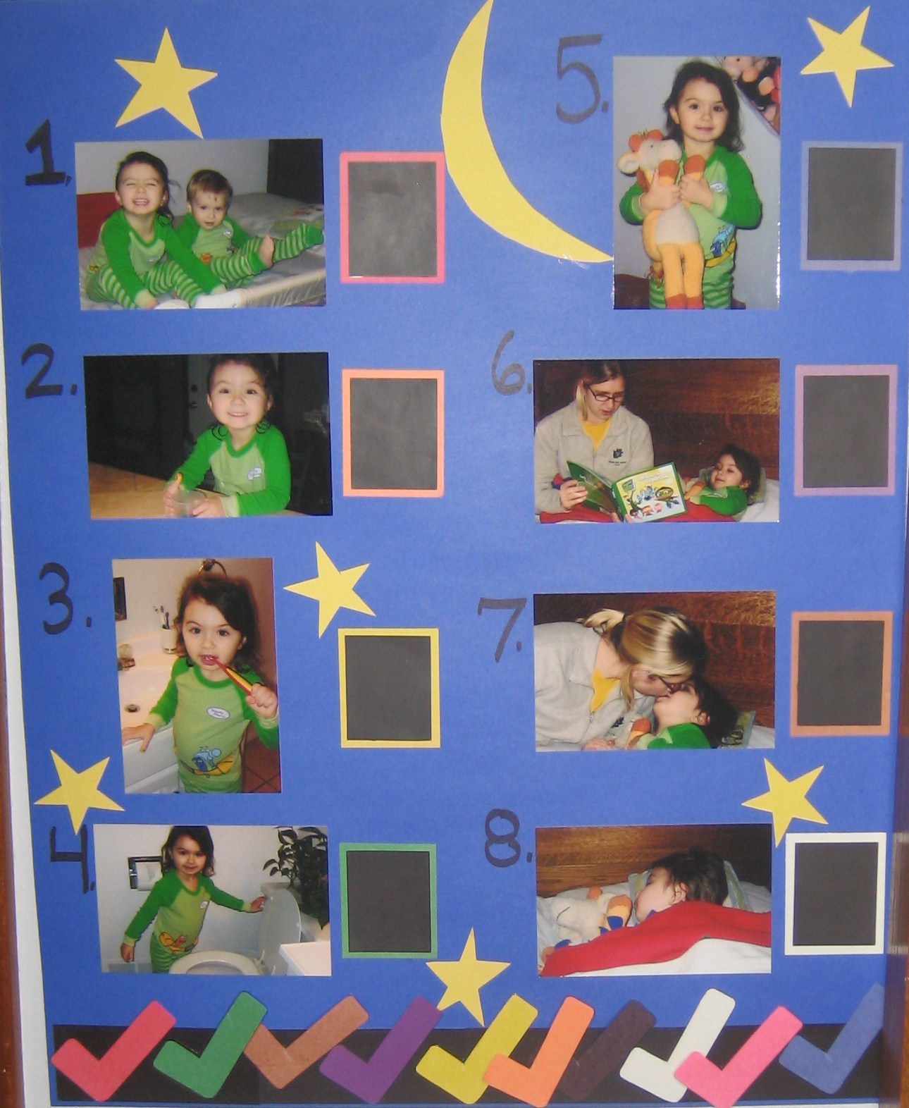 Elkészíthetitek a reggeli-, vagy esti rutin folyamatát is fotókból. A lenti képen például az esti lefekvés folyamatát követhetik nyomon a gyerekek. Amelyik tevékenységgel készen vannak, oda felrakhatnak egy pipát (mágneslapocskák segítségével).